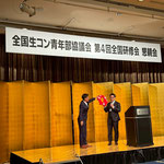 最後は、大阪青年部会長から、来年開催地の鹿児島県青年部会長に万博マスコットの「みゃくみゃく首飾り」が引き継がれ、大いに盛り上がりました。